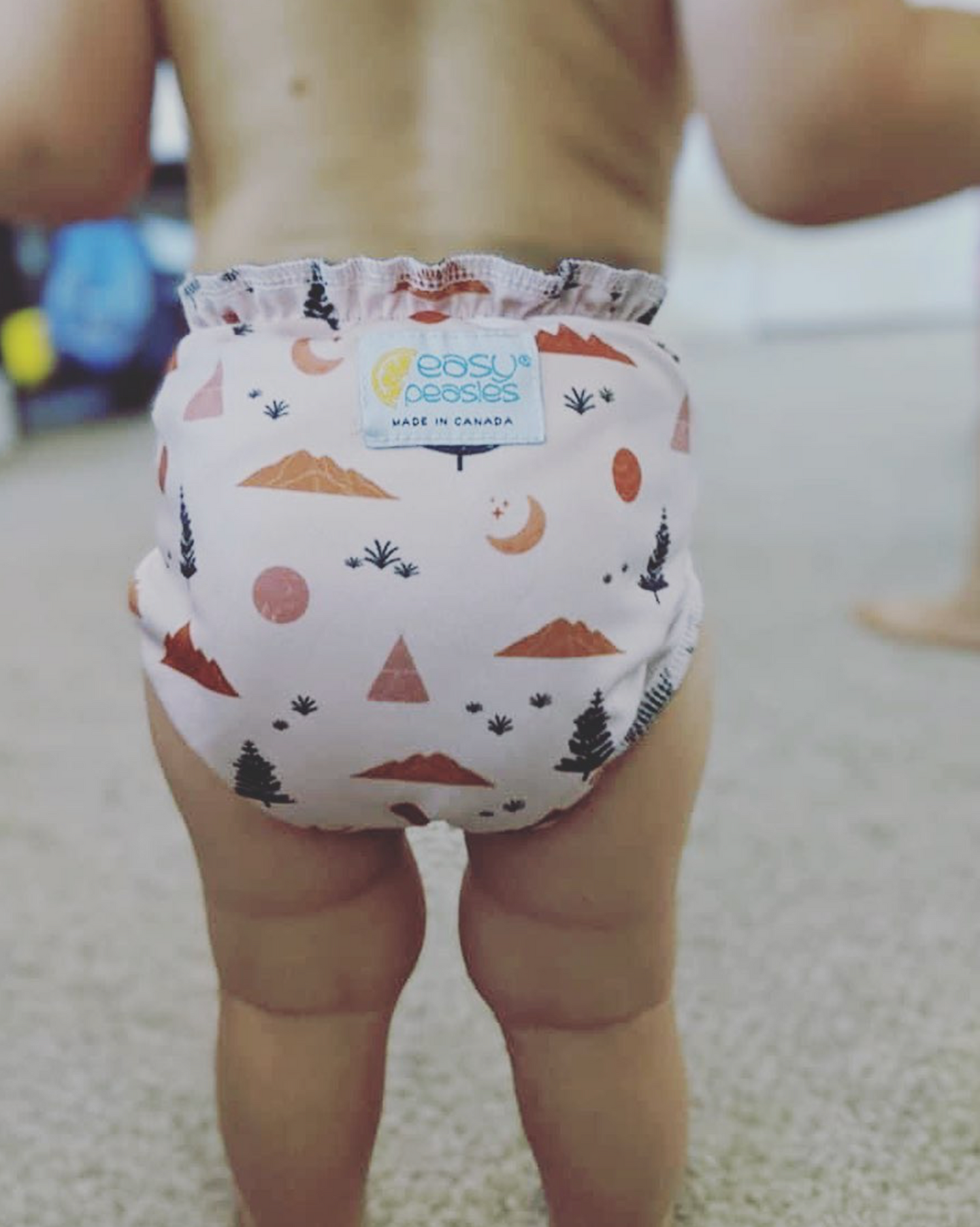 Easy Peasies cloth diapers grow with your baby. By using the perfect arrangement of adjustable rise and waist snaps, caregivers can customize the fit for each individual child.